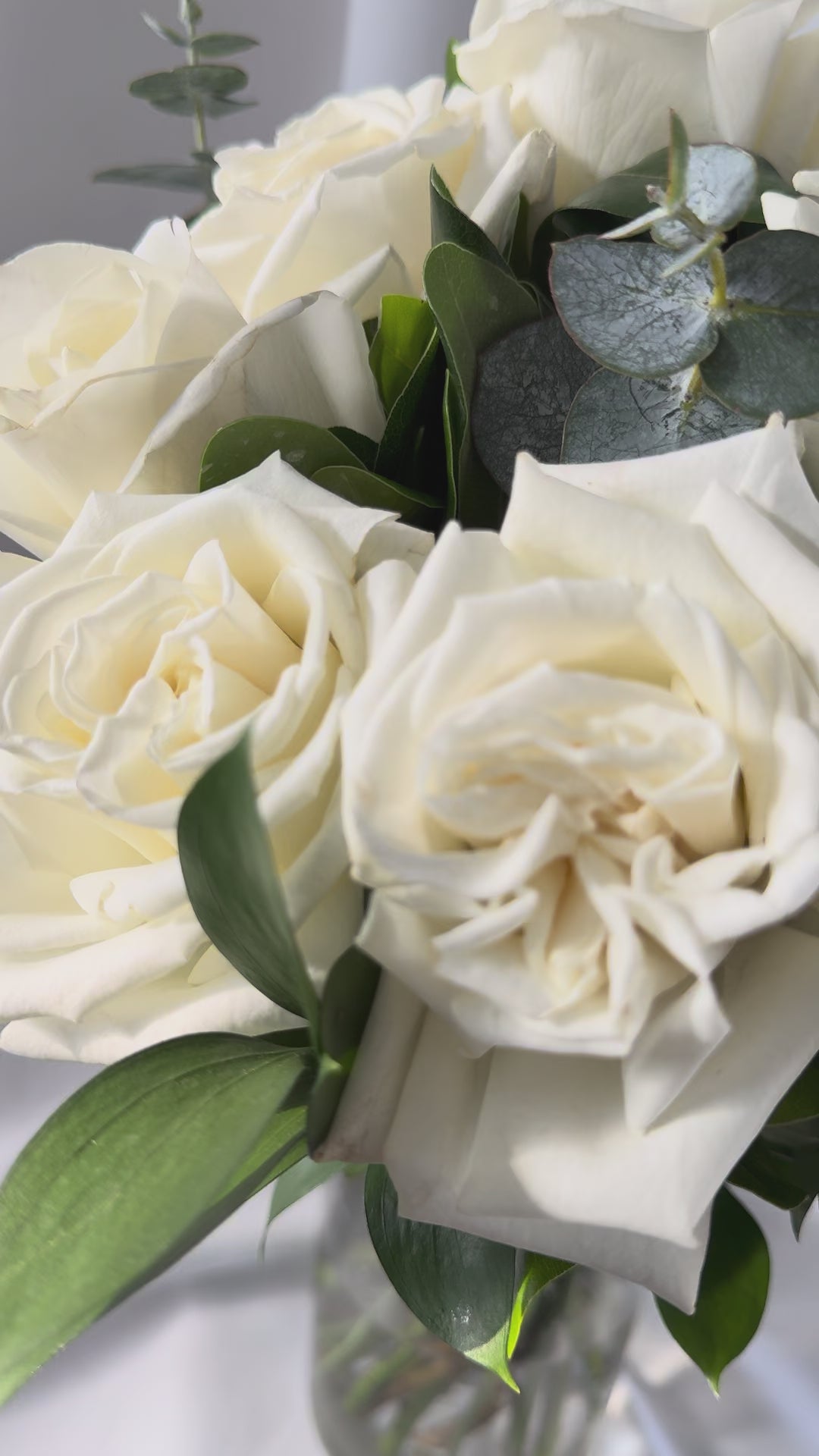 Vase option will be a glass vessel appropriate for the design, including premium greens and eucalyptus.